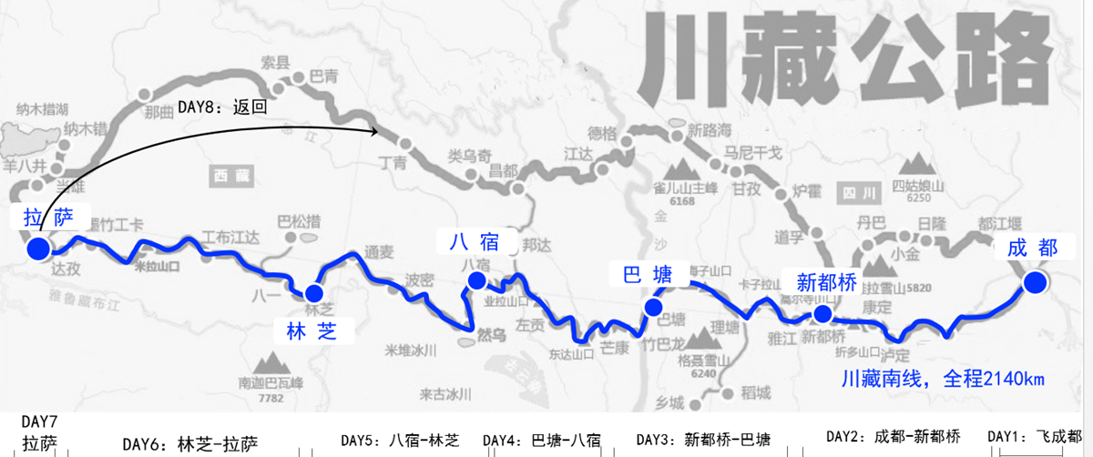 川藏南线为318国道成都—拉萨段,是这条景观大道中最美、最精彩的一段,然而它又是中国路况最险峻、通行难度最大的公路,它所穿越的青藏高原东部横断山脉地区是世界上地形最复杂和最独特的高山峡谷地区。
